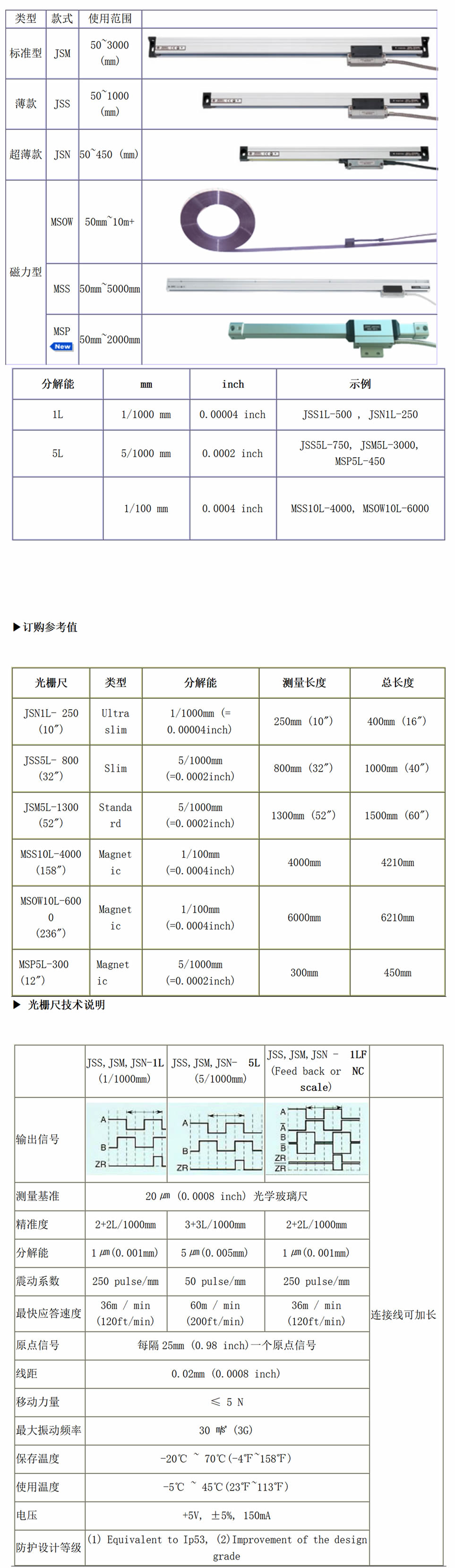 2.JENIX光柵尺藉由光電子在線距0.02mm的原點(diǎn)記憶,提供輸出信號給顯示器,包括光源有刻度的主尺及分度尺和受光子素。